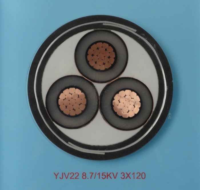 YJV22、 8.7/15KV 、3*120、銅芯交聯(lián)聚乙烯絕緣鋼帶鎧裝聚氯乙烯護(hù)套電力電纜。